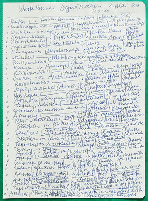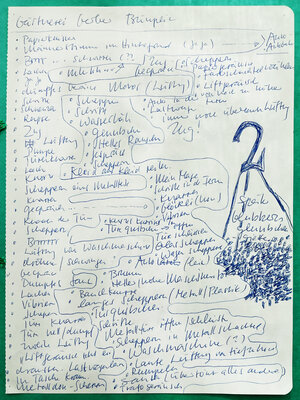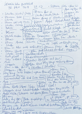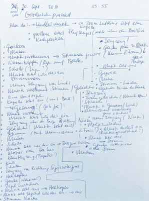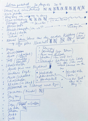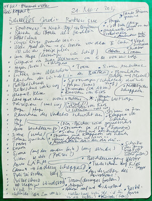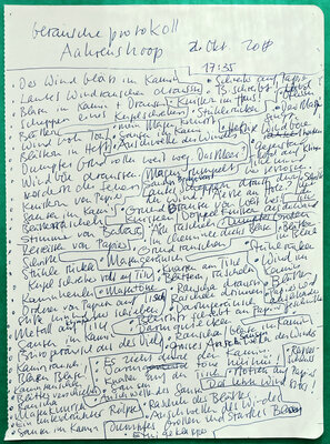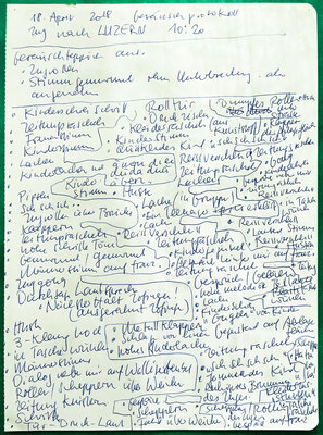Im Laufe der Zeit zeichnete ich an den verschiedensten Orten auf der Welt solche Geräuscheptrotokolle auf: in Brüssel, Paris, New York, Siena, Kinghasa usw. Auch in meiner nähren Umgabung habe ich protokolliert: im Wartezimmer meiner Gynäkologin, im Covidimpfzentrum, im Zug, in einer verlassenen Gärtnerei, in einer Ferienwohnung oder auch in diversen Cafés oder Restaurants.