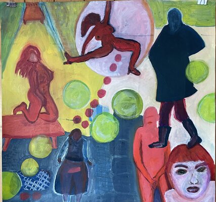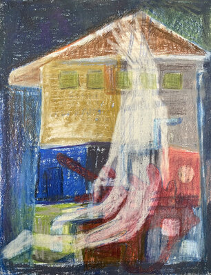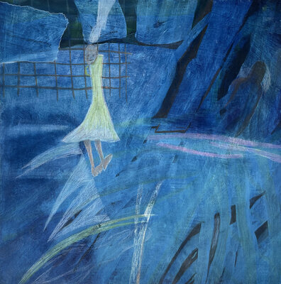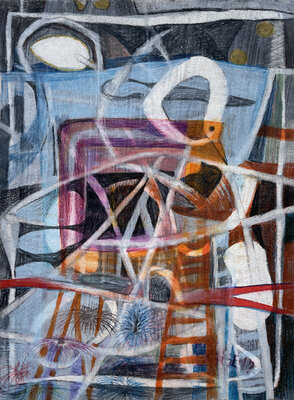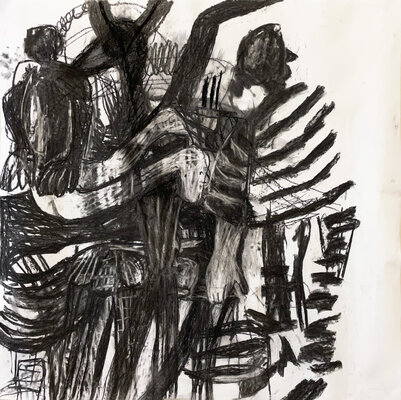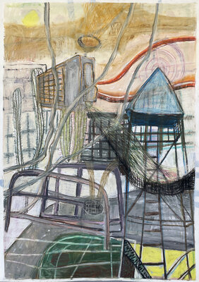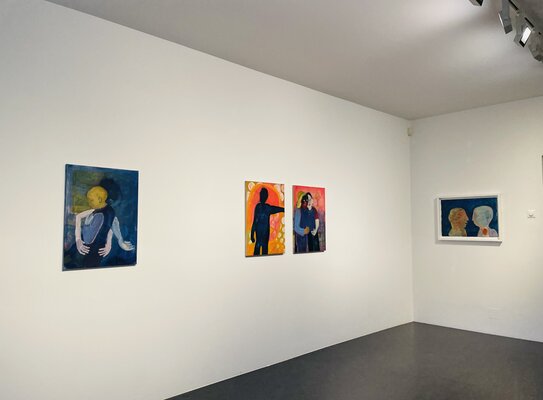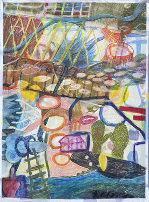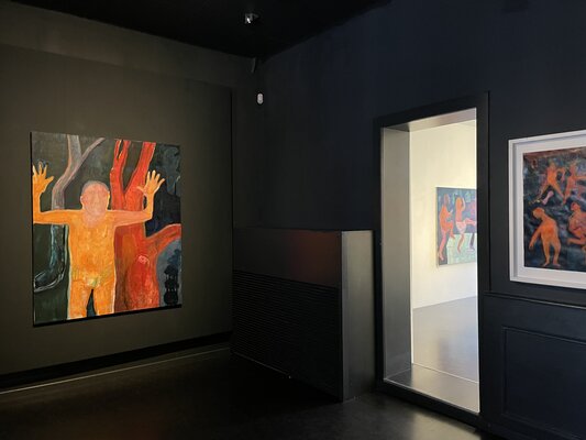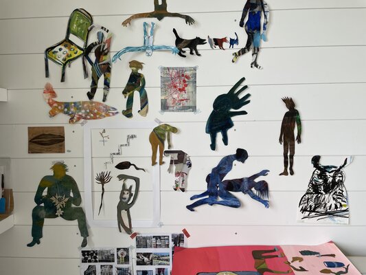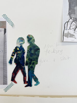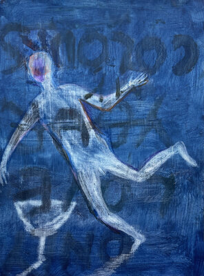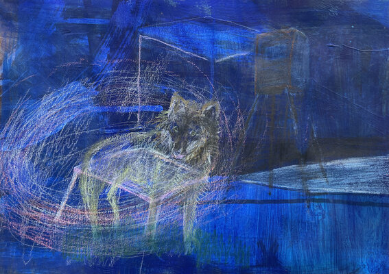 Oft auf alte, neu grundierte Arbeiten. Die blauen Zeichnungen entstanden teilweise bereits im Dezember 2023