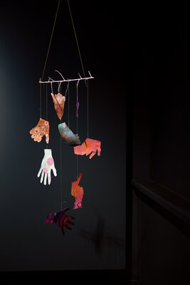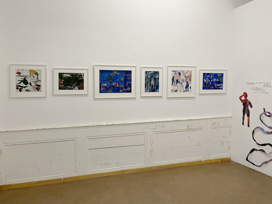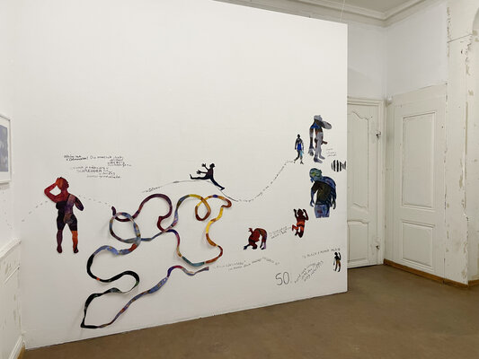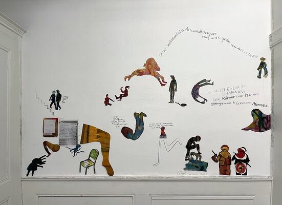 Installation aus gerahmten Arbeiten, Zitaten, Papercuts und Kohlezeichnung in der Galerie DuflonRacz in Bern (Januar 2025)