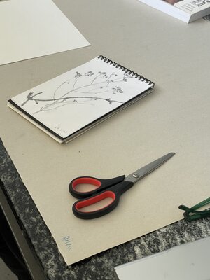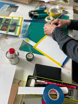 Basics: Skizzenbuch (!) Bleistifte, Gummi, eine spitze Schere, Abdeckband für sensible Oberflächen, Leim, Skizzenpapier und Farbstifte.
